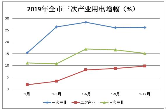 1.行業生產用電量增長10.06%。2019年,全市全行業用電量127.69億千瓦時,同比增長10.06%。分產業看,三次產業增速呈現一三二梯次全面增長,第一產業0.50億千瓦時,增長26.12%;第二產業120.14億千瓦時,增長9.72%;第三產業7.06億千瓦時,增長15.11%。其中,第二產業拉動行業生產用電增長9.17個百分點,引領三次產業。