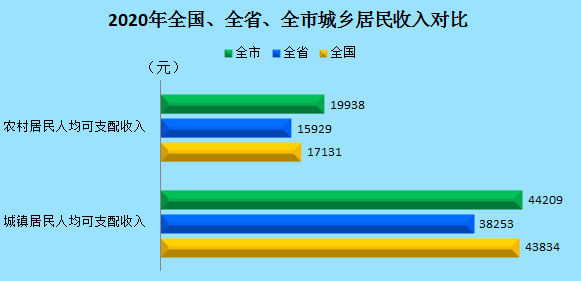 (三)民生領域。一是居民收入名義增速跑贏GDP。2020年,全市城鎮(zhèn)、農(nóng)村居民人均可支配收入分別為44209元、19938元,分別比上年增長5.6%、8.6%,總量均居全省第2位,增速分別高于GDP增速1.7、4.7個百分點,分別居全省第18、15位,其中城鎮(zhèn)居民人均可支配收入首次超過全國平均水平,比全國平均水平高375元,農(nóng)村居民人均可支配收入增速較上年提升5位。城鄉(xiāng)居民人均收入比值為2.22,比上年縮小0.06,低于全國(2.56)、全省(2.4)。二是就業(yè)目標超額完成。2020年,全市城鎮(zhèn)登記失業(yè)率3.94%,其中新增就業(yè)17797人、失業(yè)人員再就業(yè)6065人、農(nóng)村勞動力轉移就業(yè)71116人。三是物價漲幅逐月回落。全年居民消費價格上漲4%,低于上年4.1%的漲幅。八大類價格指數(shù)“兩升五降一平”,其中,食品煙酒價格、其它用品和服務分別上漲14.3%、3.8%,衣著、居住、生活用品及服務、交通和通信、醫(yī)療保健分別下降0.7%、1.7%、0.9%、1.9%、0.5%,教育文化和娛樂持平。全年居民消費價格逐月回落,12月份為全年最低點,比上年下降0.5%。四是生態(tài)環(huán)境保持優(yōu)良。2020年空氣質量優(yōu)良率達98.6%,居全省第2位;6項監(jiān)測指標平均濃度均達標,重點考核指標細顆粒物濃度(PM2.5)29ug/m3,比上年下降3.3%。全市規(guī)上工業(yè)綜合能源消費量788.02萬噸標準煤,增長0.2%。高耗能行業(yè)中,石油、煤炭及其他燃料加工業(yè)下降13.8%,化學原料和化學制品制造業(yè)下降7.6%。