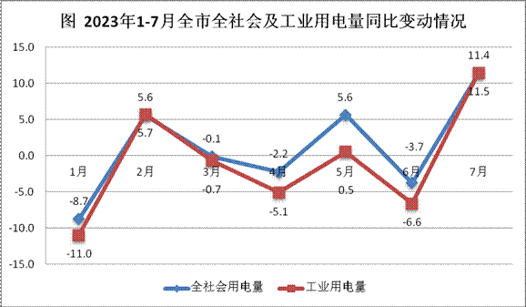 7月,全市全社會(huì)用電量14.3億千瓦時(shí),同比增長(zhǎng)11.4%,由上月下降3.7%轉(zhuǎn)為增長(zhǎng),1-7月,全社會(huì)用電量92.0億千瓦時(shí),同比增長(zhǎng)1.0,扭轉(zhuǎn)1-7月下降態(tài)勢(shì)。