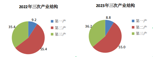 根據地區生產總值統一核算初步結果,2023年攀枝花市地區生產總值(GDP)1303.80億元,按可比價格計算,比上年增長6.5%。其中,第一產業增加值115.27億元,增長4.2%,對經濟增長的貢獻率為6.2%,拉動經濟增長0.4個百分點;第二產業增加值717.30億元,增長6.3%,對經濟增長的貢獻率為52.5%,拉動經濟增長3.4個百分點;第三產業增加值471.23億元,增長7.3%,對經濟增長的貢獻率為41.3%,拉動經濟增長2.7個百分點。三次產業結構由上年的9.2:55.4:35.4調整為8.8:55.0:36.2。全市民營經濟增加值651.15億元,增長6.1%,占GDP的比重為49.9%。