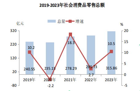 全年社會消費品零售總額315.86億元,比上年增長10.5%。按經營地分,城鎮消費品零售額285.10億元,增長10.4%;鄉村消費品零售額30.76億元,增長11.7%。按消費形態分,商品零售267.68億元,增長10.2%;餐飲收入48.19億元,增長12.4%。