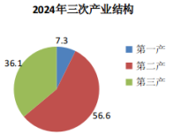 根據地區生產總值統一核算初步結果,2024年攀枝花市地區生產總值(GDP)1395.24億元,按可比價格計算,比上年增長6.3%。其中,第一產業增加值102.14億元,增長3.6%,對經濟增長的貢獻率為4.7%,拉動經濟增長0.3個百分點;第二產業增加值790.14億元,增長6.4%,對經濟增長的貢獻率為56.9%,拉動經濟增長3.6個百分點;第三產業增加值502.95億元,增長6.8%,對經濟增長的貢獻率為38.4%,拉動經濟增長2.4個百分點。三次產業結構由上年的7.6:56.7:35.7調整為7.3:56.6:36.1。全市民營經濟增加值711.75億元,增長7.3%,占GDP的比重為51.0%。