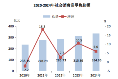 全年社會消費品零售總額334.95億元,比上年增長6.0%。按經營地分,城鎮消費品零售額301.63億元,增長5.8%;鄉村消費品零售額33.33億元,增長8.3%。按消費形態分,商品零售276.12億元,增長3.2%;餐飲收入58.83億元,增長22.1%。