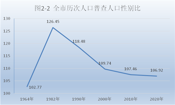 全市常住人口[2]中,男性人口為626361人,占51.67%;女性人口為585842人,占48.33%。人口性別比(以女性為100,男性對女性的比例)由2010年第六次全國人口普查的107.46下降為106.92。