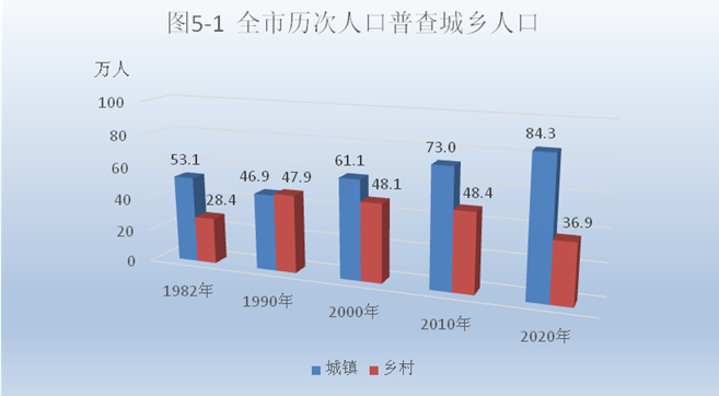 全市常住人口[3]中,居住在城鎮的人口為843378人,占69.57%;居住在鄉村的人口為368825人,占30.43%。與2010年第六次全國人口普查相比,城鎮人口增加113647人,鄉村人口減少115565人,城鎮人口比重上升9.47個百分點。