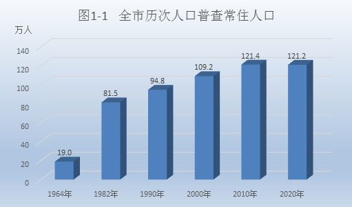 全市常住人口[2]為 1212203人,同第六次全國人口普查2010年11月1日零時的1214121人相比,減少了1918人,下降0.16 %。