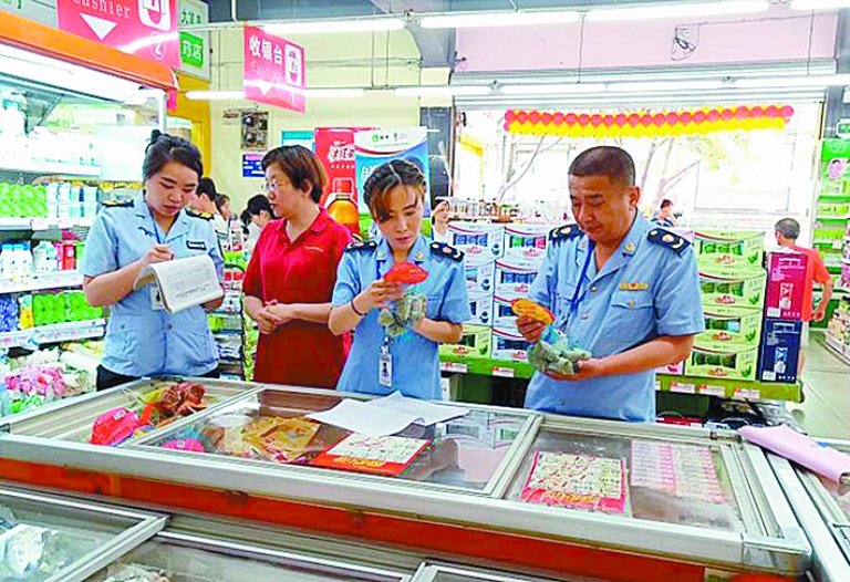 6月8日,東區向陽村市場監督管理所執法人員在轄區某超市檢查粽子等端午節熱銷食品。