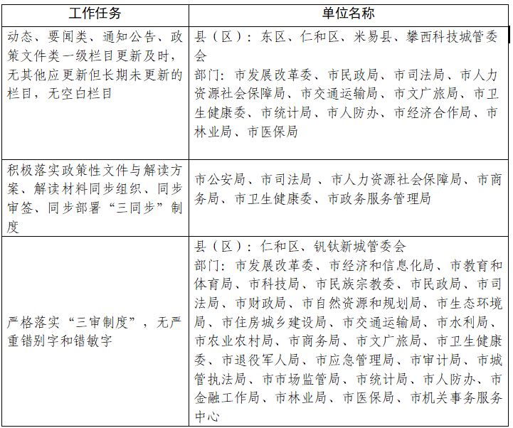 (一)運維保障有待進一步加強。一是網站內容保障不到位,多個政府網站存在錯別字和欄目不更新問題,如鹽邊縣人民政府門戶網站出現多個錯別字,市應急管理局等政府網站存在多處欄目更新不及時,觸及網站“健康底線”,“四不”問題有反彈跡象。二是政策解讀工作不到位,如發布的政策文件缺少配套政策解讀,解讀稿件未能與被解讀文件相關聯。三是決策公開不到位,多數部門在正式出臺事關民生的政策文件之前,未在網上開展意見征集,公開征集社會各界意見并公布反饋結果。四是整改工作落實不到位,如市扶貧開發局網站針對發現的問題未能及時整改,同一個問題連續多月反復出現。