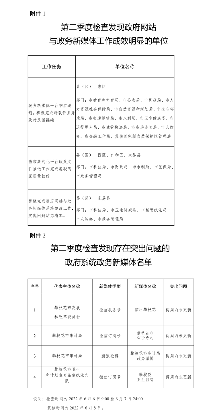 攀枝花市人民政府辦公室關于2022年第二季度全市政府網站和政府系統政務新媒體檢查暨上半年檢查情況的通報