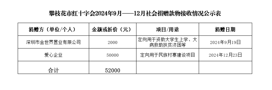 攀枝花市紅十字會2024年9月——12月社會捐贈接收情況公示