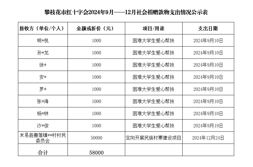 攀枝花市紅十字會2024年9月——12月社會捐贈款物支出情況公示