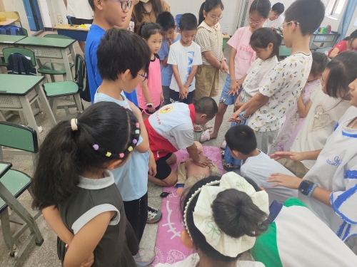 活動中,區紅十字會核心講師劉老師結合真實案例,通過視頻講解、現場演示、實操互動等形式,重點傳授了氣道異物梗阻急救、心肺復蘇等關鍵技能,并針對暑期常見的溺水、中暑、火災、燒燙傷、地震、交通事故及流鼻血等意外的預防與處置方法進行了細致講解。在實操環節,孩子們在老師的耐心指導下,借助專業道具輪流模擬練習,不僅快速了解了實用的急救技能,更深化了安全防護意識。這場“暑”你安全主題教育課,既有效提升了青少年的自我保護能力,也激發了他們的學習熱情與社會責任感,讓孩子們真切體會到生命的可貴與守護的意義。