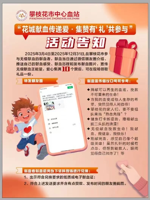 2025年,攀枝花市推出花城獻血傳遞愛·集贊有‘禮’共參與”活動,2025年3月4日至2025年12月31日,在攀枝花市參與無償獻血的獻血者,獻血當日通過微信朋友圈介紹、推送自己的獻血感受、獻血歷程和發布獻血圖片,宣傳無償獻血正能量,愛心集滿10個贊后,可在現場領取禮品一份。通過有獎激勵,進一步提高無償獻血的宣傳范圍和力度。